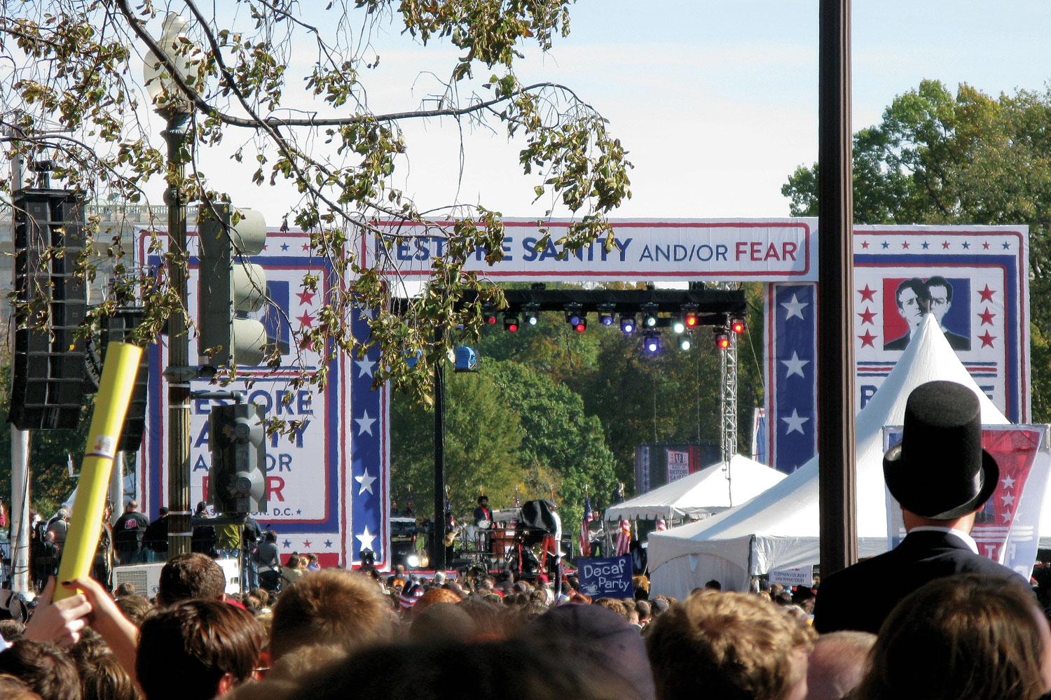 Further ahead, someone’s gently waving their cardboard cut-out of the Reddit.com alien. Somewhere on my far left I see “I have a PhD in Horribleness” bobbing up and down. I was starting to think the point of the event was to meet people from the internet, but thankfully, the sprinkling of Yoda quotes and occasional vampire costume legitimized this rally for me. On the eve of a major election, I’m glad I’m here to witness this sobering political touchstone channeled through Kid Rock, the guys from Mythbusters and R2D2.