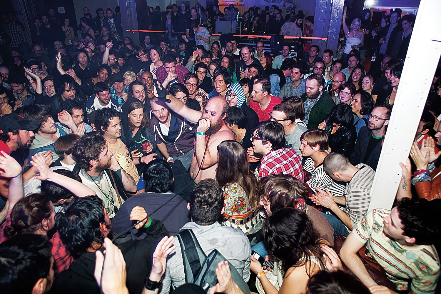 Inside the Espace Réunion there is nondescript synth-driven electro-pop playing, and the place is just one huge, sparse white room broken up with pillars, like a pre-fabricated music venue brought to Montreal on the back of a tractor trailer. It is full of moving bodies, and we dance stupidly for a bit, but Les Savy Fav isn’t on until two in the morning and the music is boring and I’m exhausted.