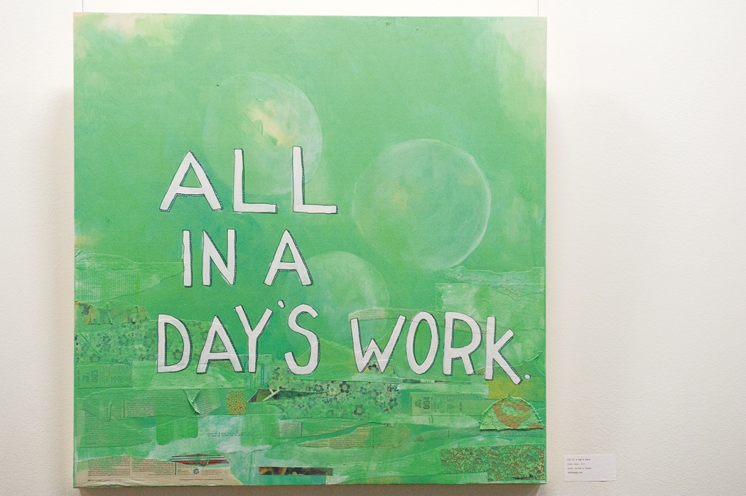 The mixed-media collection pushes the boundaries of typical canvas paintings, using unconventional materials—All in a Day’s Work, the sixth installment of What Now? reveals bus transfers, newspaper clippings, fragments of a map, and bits of fabric.
