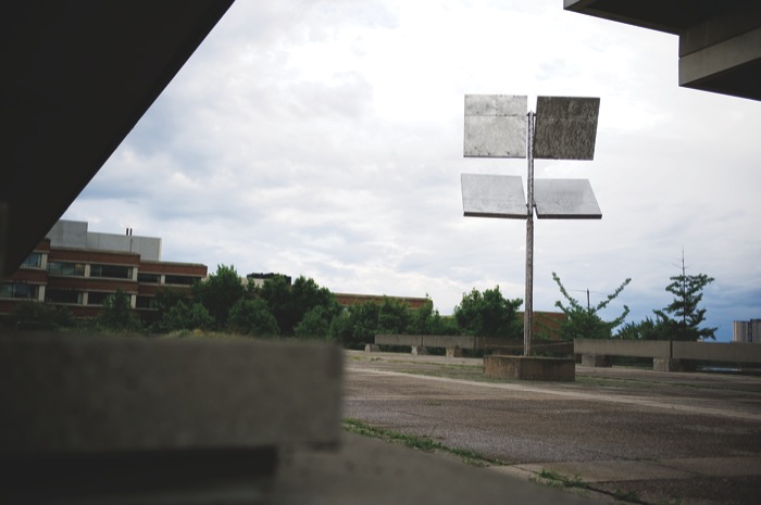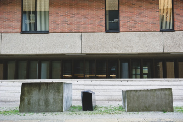 The tour started with a sculpture I didn’t know existed. Jocelyne Alloucherie’s minimalist Noire Solaire, Basse (1 – Left) sits between Vari Hall and the Behavioural Science building. It is a small slab of dark rock between two large concrete-like slabs, gently curved around the edges — the formation is meant to mimic the Canadian Shield, a geological rock formation.