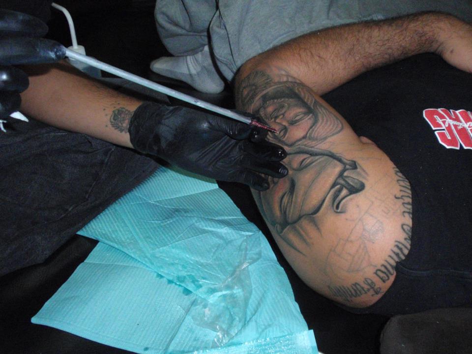 The process is gruelling, as his hands and arms become the machine used to permanently implant ink onto the body. After the process is over the customer’s upper arm is covered with shading and crisp black lines that form a picture of Jesus and Mary. It’s all in a day’s work.