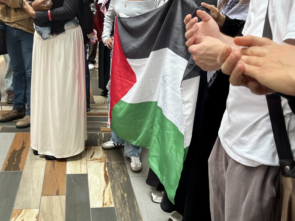 The student leading the protest shifted discussions to a story of his family, describing his father’s displacement in Palestine, eventually fleeing to Kuwait due to the Israeli military. He then gave the floor to another student, also from Kuwait, who volunteered to speak and discuss his reasons for attending the protest. He described how he wanted to represent his country and three Kuwaiti doctors who were mistreated by Israel aboard a Sumud flotilla.