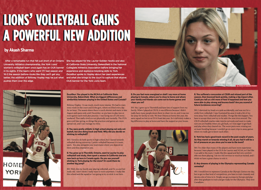 She has played for the Laurier Golden Hawks and also at California State University, Bakersfield in the National Collegiate Athletics Association before bringing her experience and explosive blocking skills to York. Excalibur spoke to Hopley about her past experiences and what she brings to the court to capture that elusive OUA banner for the York Lions team.