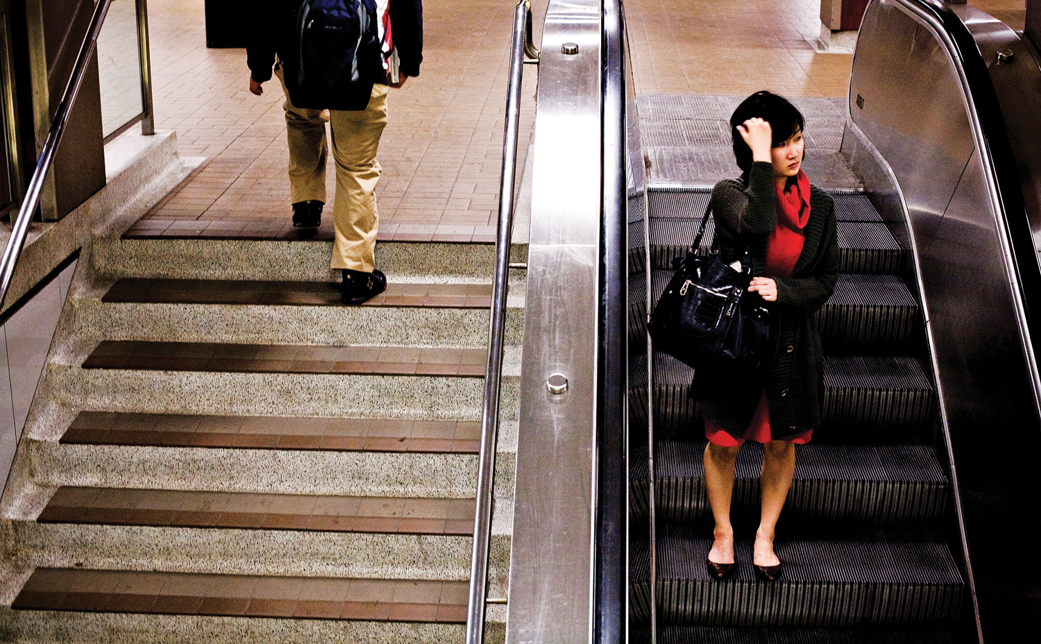 They’re man-made landscapes. They are true public space where different ages, cultures, lifestyles and classes cross paths. Since this place is a thoroughfare, within minutes it can go from the downtown push and press to a ghost town. These photos highlight both the bustle and the solitude to which the subway plays host. They reflect loneliness though they are filled with people.