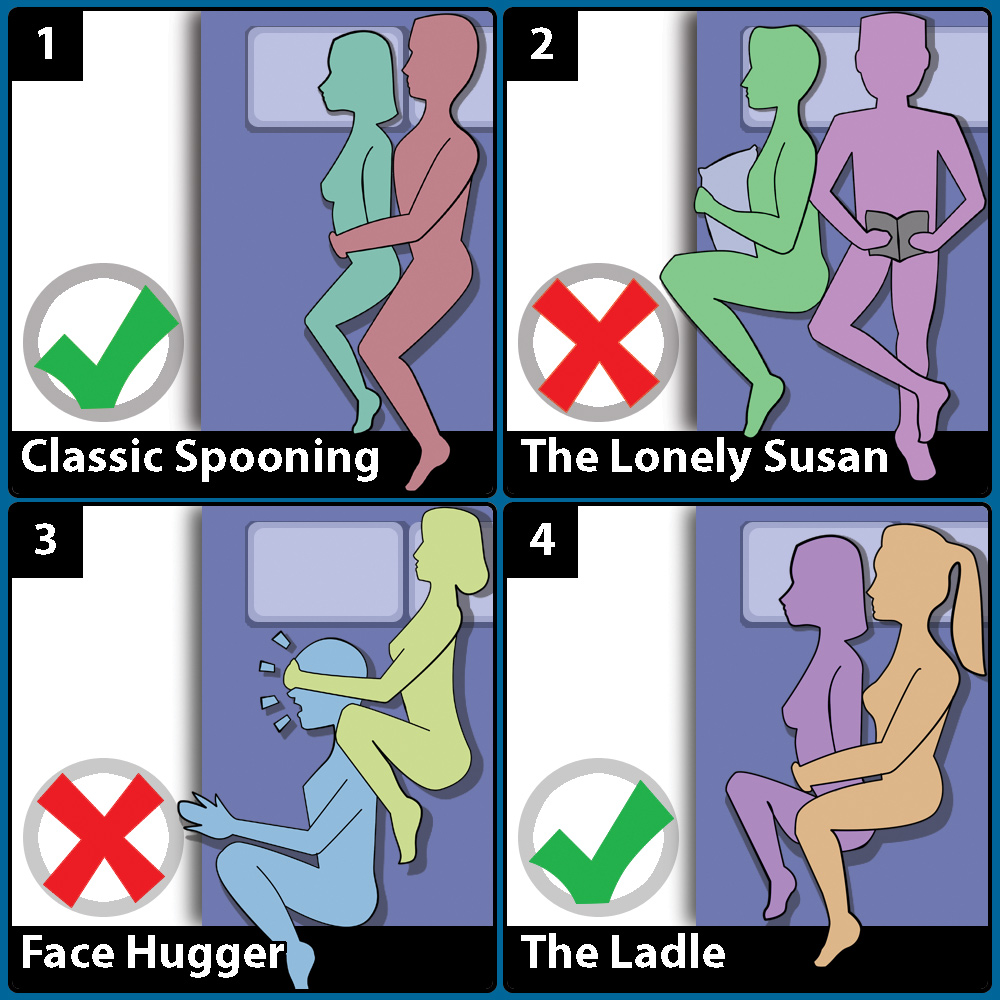 Make sure to be limber and well stretched before attempting any high level snuggling techniques, as cramps can happen at any time. Now, when both of you are relaxed, you have a few options. The safest one is to go for the novice’s first choice, The Spoon. Both lay on their sides, facing the same way. The one behind the other is the “big spoon,” cradling the smaller spoon. This is a good beginner stance as it allows free movement, a free arm for caressing, and enough closeness for some down and dirty shoulder or ear nibbling.