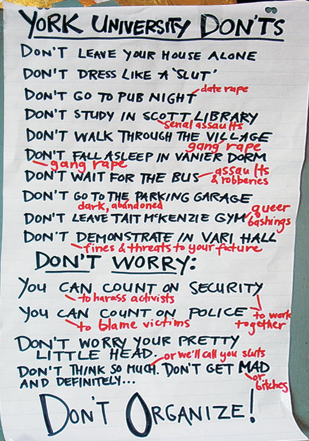 Several posters were also put up around campus in the weeks following the comment, including a large list of York University “don’ts” in the Student Centre. The lists included items like “Don’t sleep in Vanier residence” and “Don’t go to pub night.” It concluded, in capitals, “And definitely don’t organize!”