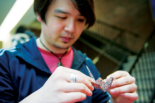 Ken Wu, president of JISA, folds a crane as part of an effort to raise money for Japan. (Pippin Lee)