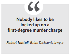 When questioned on the status of his client, Dickson’s lawyer Robert Nuttall replies that “nobody likes to be locked up on a first-degree murder charge.”