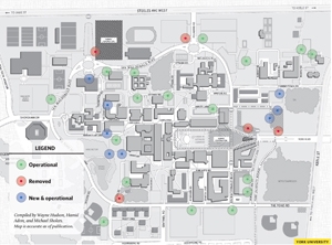 Twenty-four help intercoms— which are a part of a wider Emergency Blue Light system used to aid campus security—were found on the campus map. However, Excalibur found that five of the intercoms marked on the old map were no longer there, and that there were eight new locations, bringing the total to 25 intercoms.