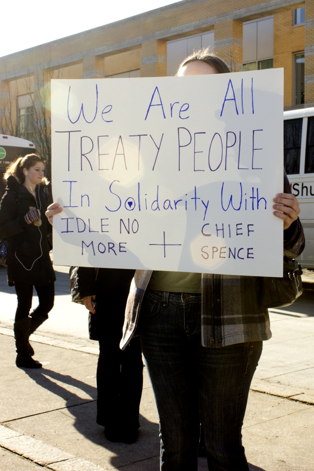 The on-campus demonstration, divided into two parts, included a round dance and a teach-in, giving students the opportunity to learn about Aboriginal culture and issues facing the community, like manageable healthcare, and the movement’s objections to Bill C-45.